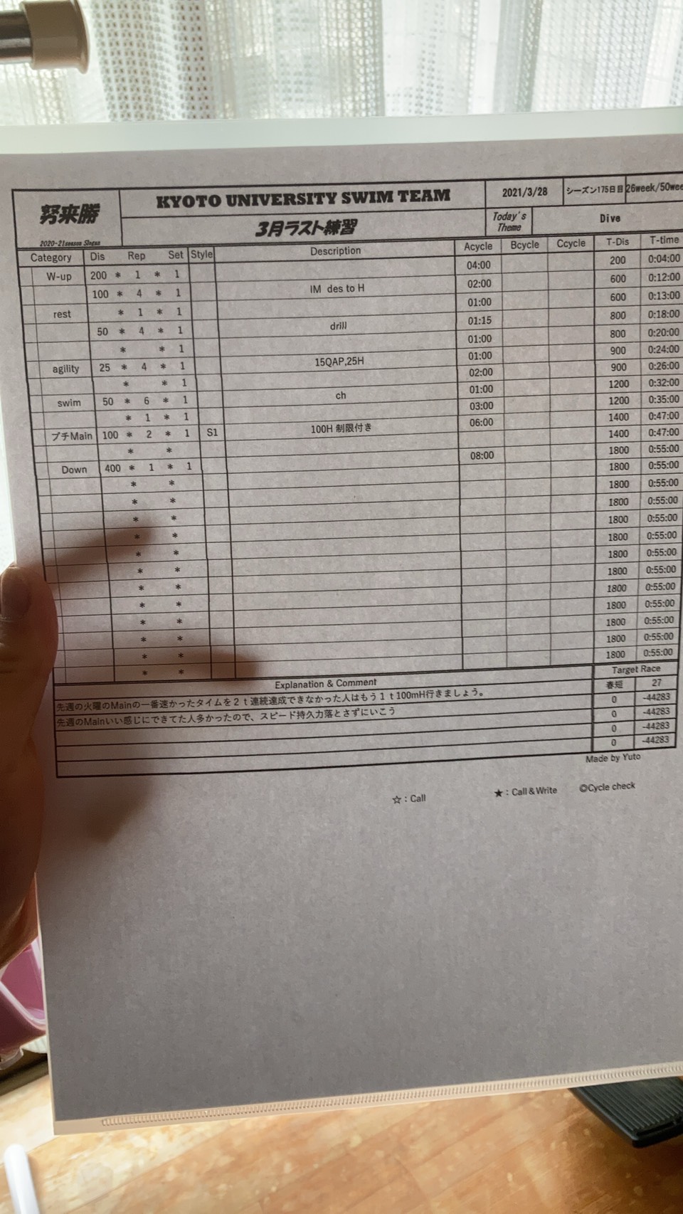 とりあえず、引退までには自粛前の1月の泳速には戻したいな、って思ってます。もう一回Aサイクル回れるようになりたいです笑