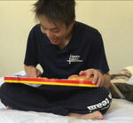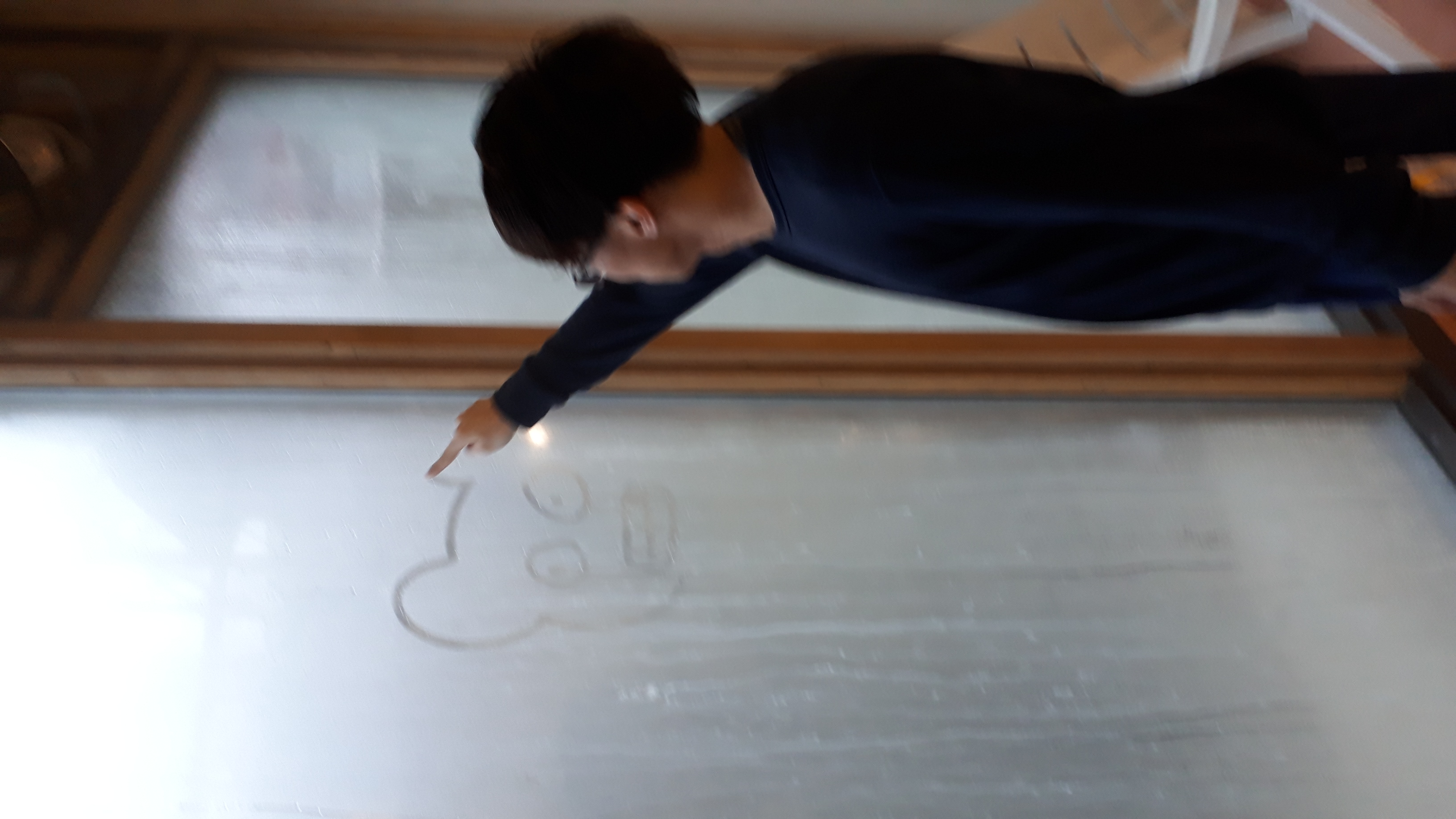 応援の最中に窓にお絵描きする航平さん。応援の合間のレストがお暇だったようです。さすが建築学科。デッサン力安定していますね。