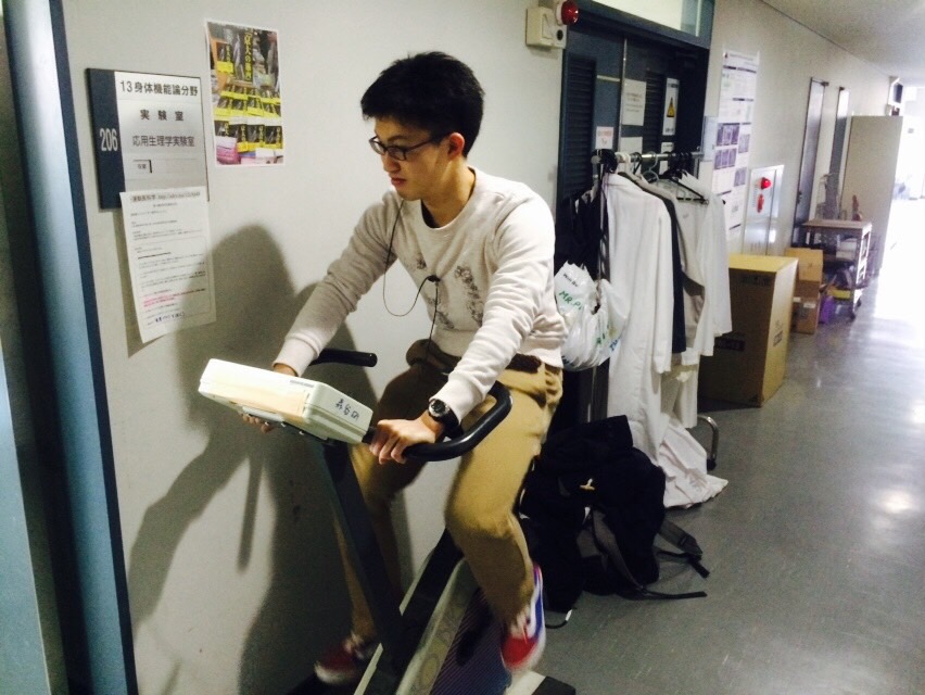 では、今日の写真は自転車エルゴメーターを漕いでいる芳賀ちゃんです。詳しいことはよくわかりませんが、これを漕ぐと色んなことがわかるらしいです。