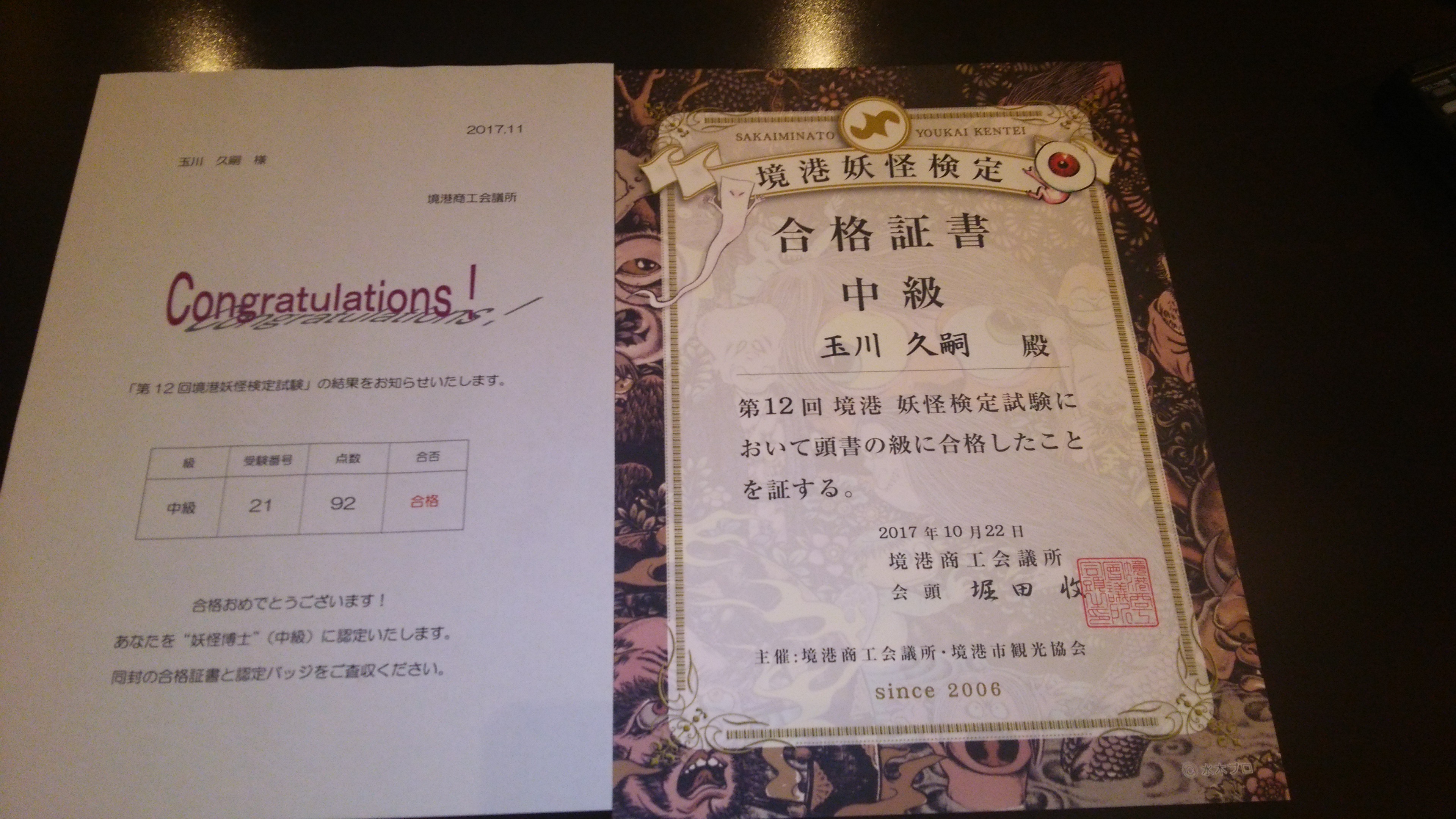 写真右は妖怪検定の合格証書、左は妖怪検定合格者にのみ与えられる鬼太郎の妖怪博士ピンバッチです。今年はなんと中級は101人受けて13人しか合格していません‼(どや顔) このピンバッチは通学用リュックにつけていますので、この人誰かなっと思ってもこのピンバッチで玉川だと気付いてください。