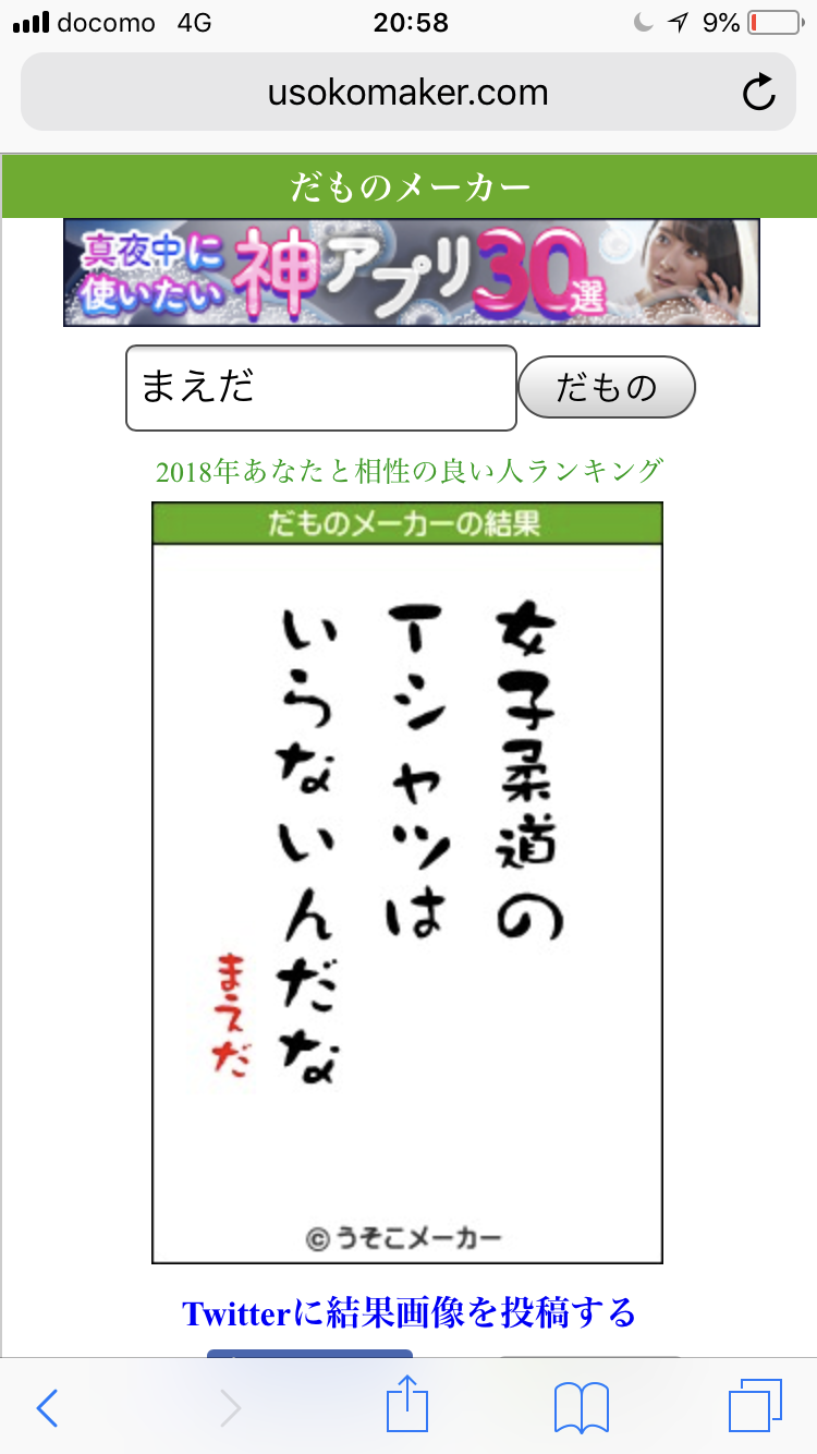 写真はこの前もっぴーに教えてもらった、だものメーカーってやつです。名前を入力するとその人の有難いお言葉を相田みつを風に作ってくれます。