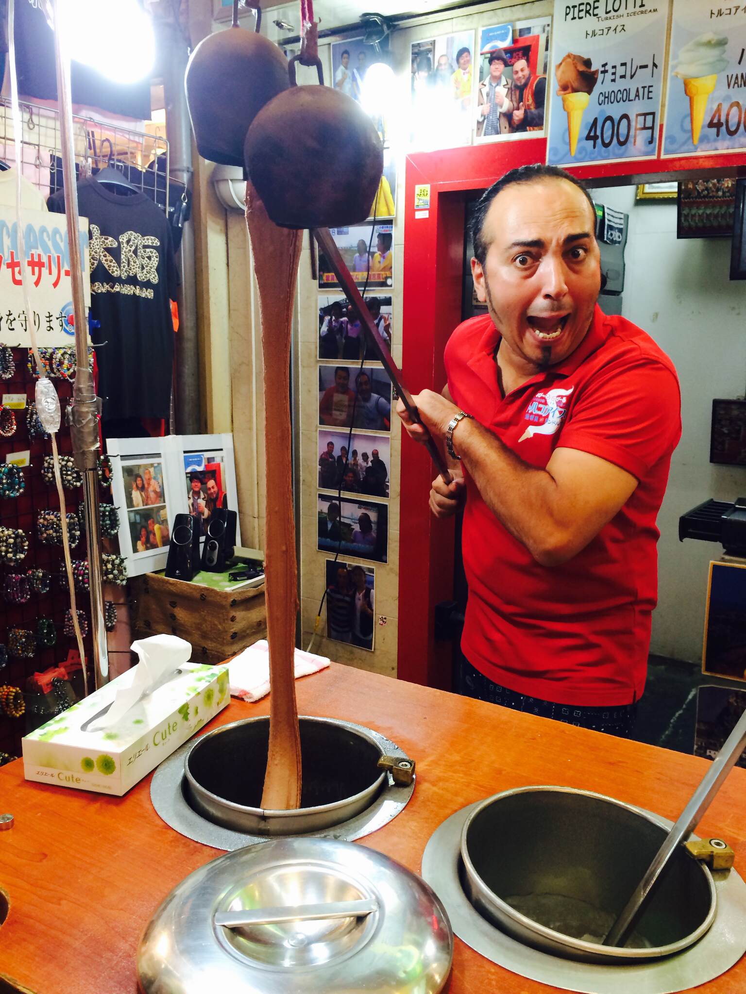 トルコ風アイスのおっちゃんと伸びてるチョコ味のアイスです。