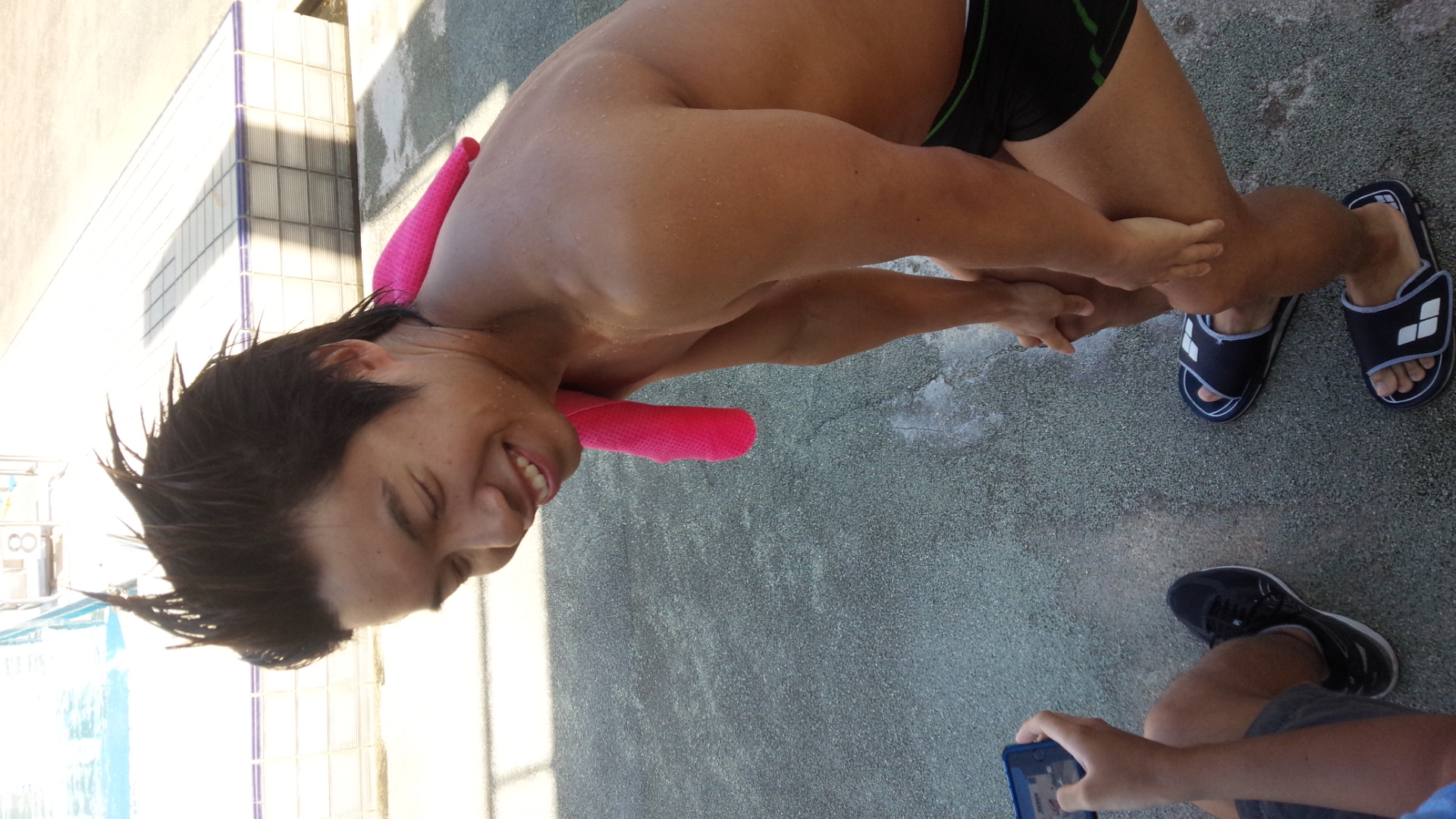 写真は、昼間の自主練習を終えたナッスーです。彼の黒い背中からもわかるように、昼間はほぼ毎日、ENか飛び込みの練習にプールに足を運んでいました。きっと「信じられる自分」になっていると思います。