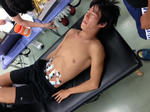 写真は、筋電図をとっている時に、脚がつった柳瀬です(笑)