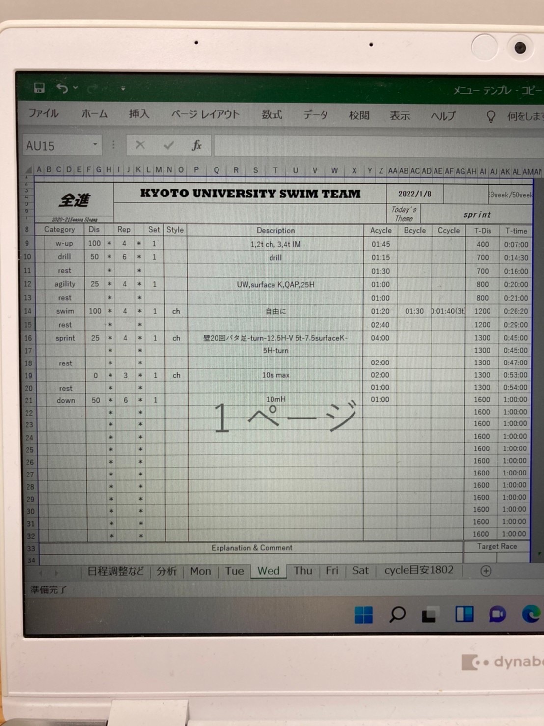 年明け初キック練だったと思います。aサイクルは1:35で6本やってました、速いねー。スイム速い人が必ずしもキックも速いわけじゃない(まぁそれでも速いけど)ってなんでなんですかね。1度、100メートルキック対決とかしたいです。ぼくは対決はいいので、予想家をしたいです。競馬みたい。