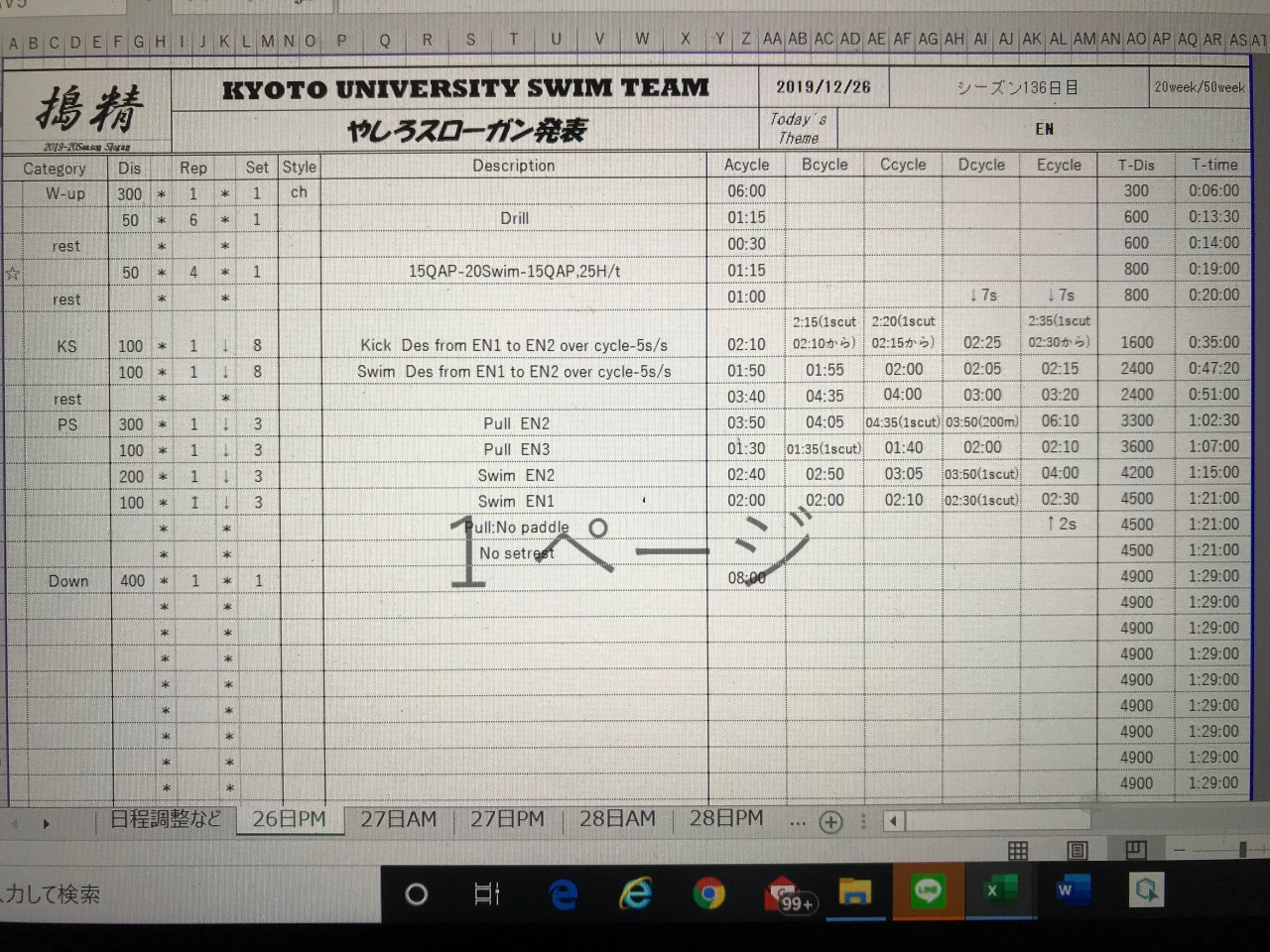 ENでした。特にプルがまだまだだなと思いました。今回の合宿でs1以外ではフリーのプルを特に意識しようと思っていて夏からなんですがやっぱり外に流れてかけていないのでもっとドリルやアップから意識しようとおもいます。しんさんにフリーやバックのプルではキャッチは胸を開いて肩甲骨をよせ、わきをしめるようにかくと教えてもらったのでやってみようと思います。
