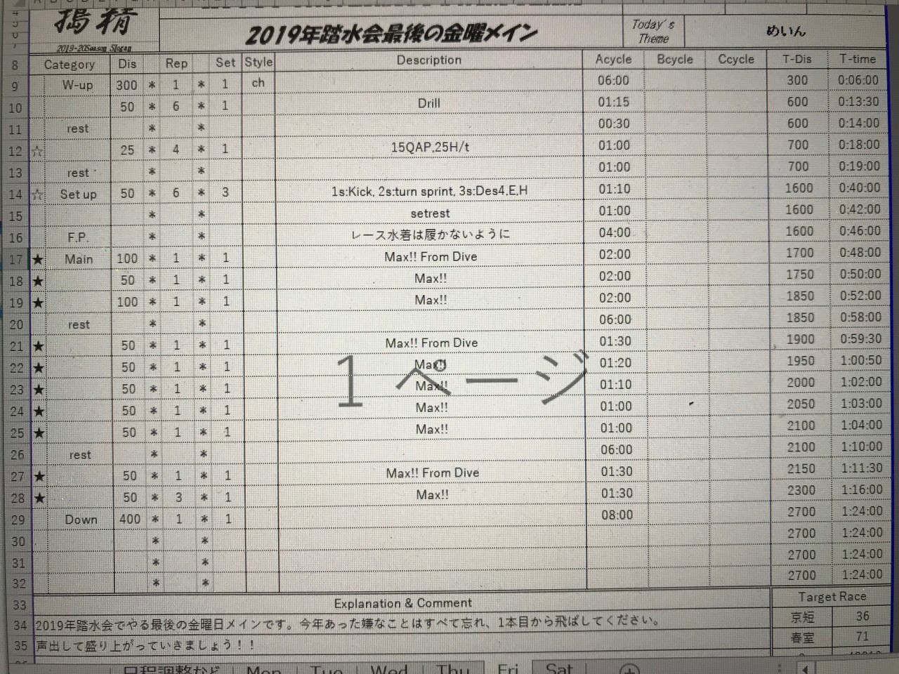 今日のメニューについてはこのくらいにしときます。明日は日下メニューですね。休憩もとりつつ集中して取り組めるメニューらしいです。楽しみですね。