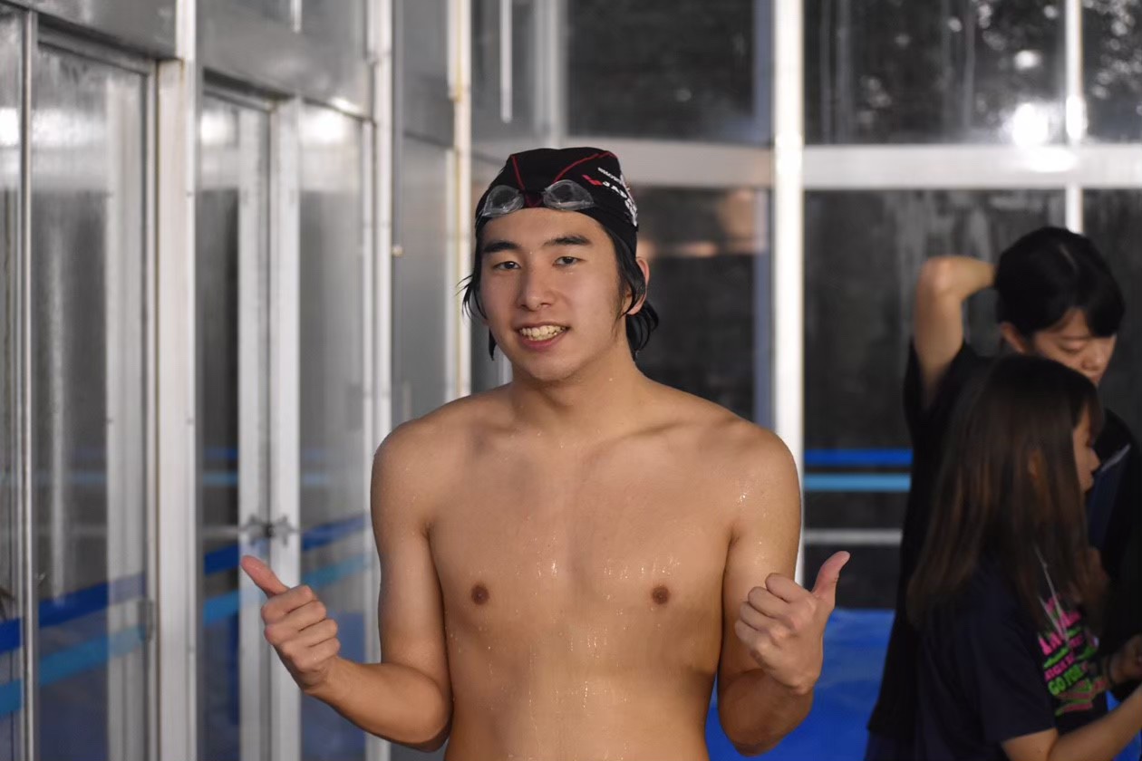 去年の秋、入部して私は水泳のこと全然知らなくて、そして私は競泳は個人競技じゃないことを知りました。皆もそう思ってると思います。一緒に練習して、チームで頑張ろってゆって、だから声出し大事やなって感じます。人のやる気って人に伝わります。モチベ低い人に流されるとかゆー問題も同じようなことかなと思います。