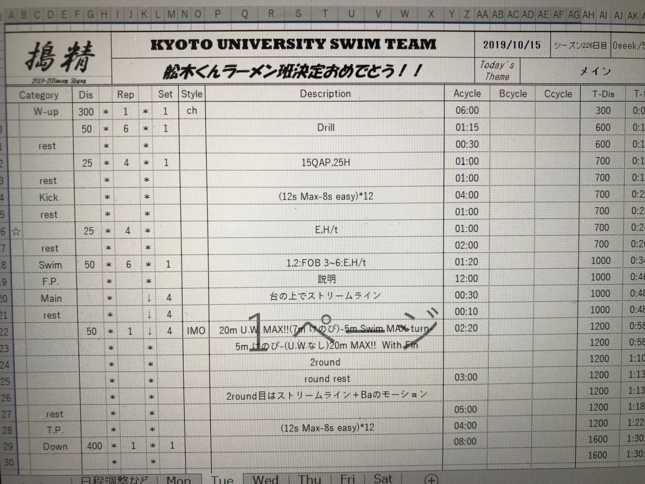 腹圧をしっかり入れましょうというメインでした。どんどん力が入らなくなって、腰に負担がかかってしまいました。僕の周りには余裕そうな人いなかったのです、相当キツいトレーニングやったんですね、もうこりごりです。オフ明けて2週間経ちましたが、調子は戻りましたか?ぼくはもう2週間たってるのにって感じです。全然速くなってる気がしません。関西国公立ob戦までに、自分の成長を練習タイムとかで示したいです。まずは、ターン技術の向上からです。
