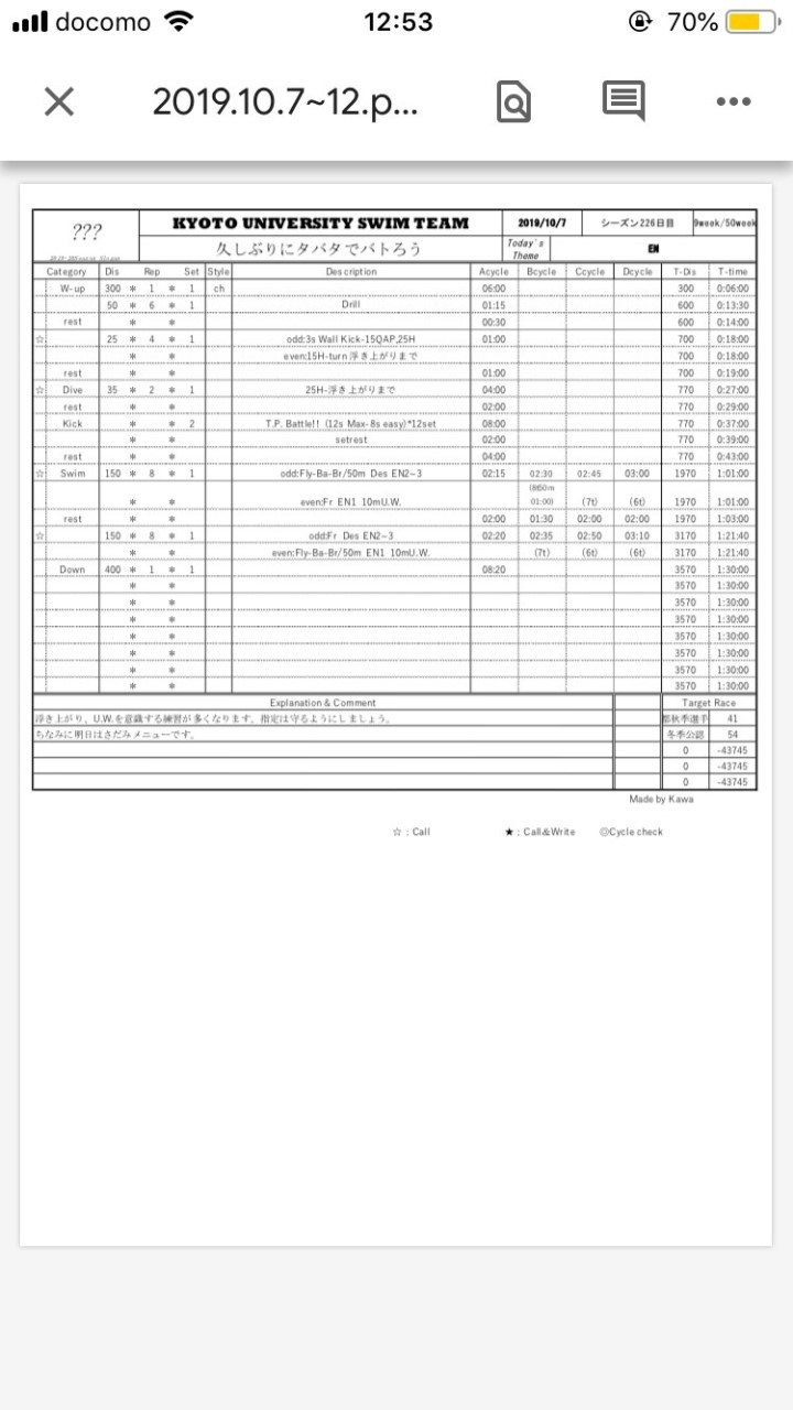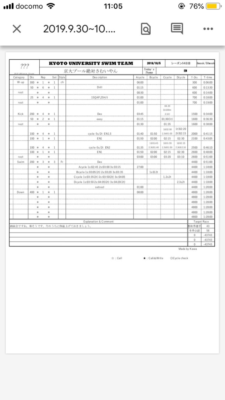 ひたすらキックして、そっからスイムディドしてって感じですね。そこまで二セット目まで頑張ってだけではないのに、体は疲れてて三セット目全然あげれなかったです。リハビリ期間と言っても、サークルとか攻めていかないと戻らないので頑張って行きます。オフ明けから気をつけてることは、プルブイとパドルを使わないことです。シンプルにそっちの方が全身運動になって痩せる感じもするし、脈も上がるし、つけたらズルしてる感じが出て嫌です。