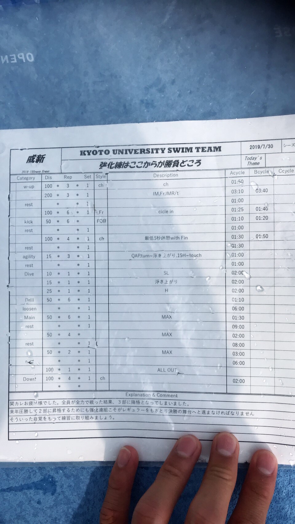 午後の耐乳酸もそうでしたが、200IMのタイムのばらつきが大きかったので1本目のタイムを維持できるようにしたいです。その後の100m4本はfr専の人は前半flyでした。苦手だし腕あがらないしできつかったです。強化練ではfr以外の種目も沢山泳げるので、全種目強化して今後につなげたいです。