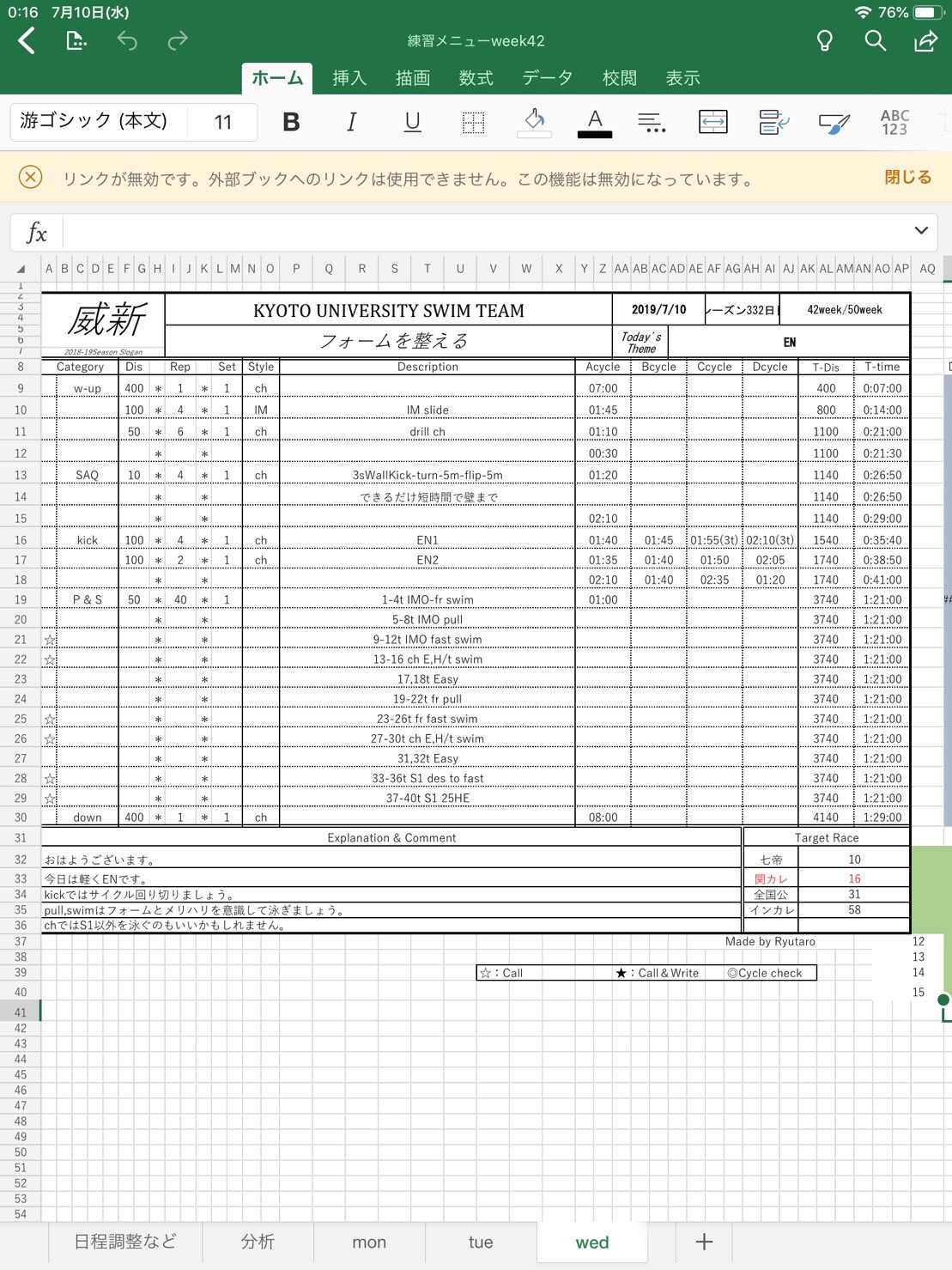 陸メニューです。いつもありがとう。キックに重点を置く練習はありがたい。