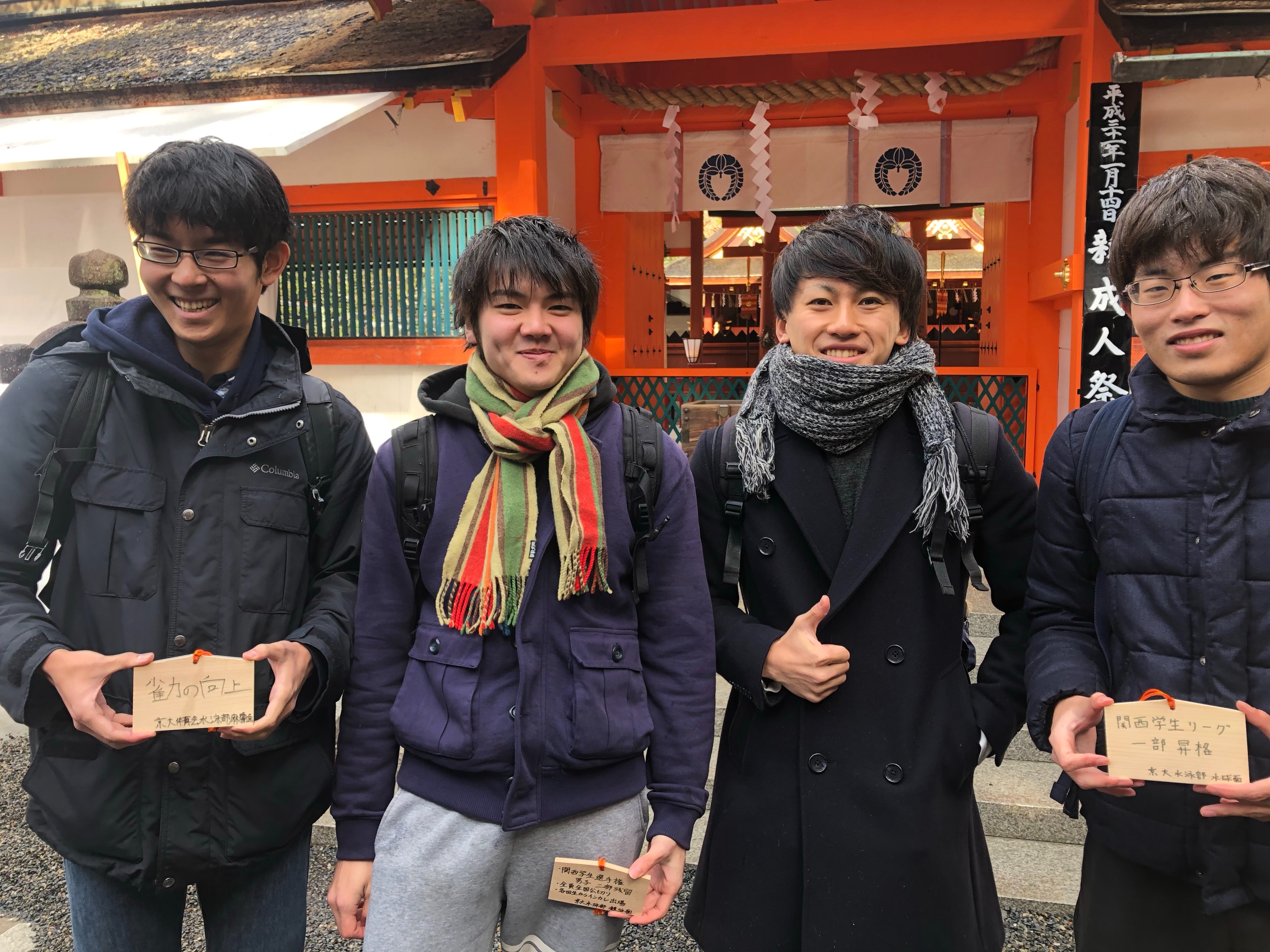 今年も大学近くの吉田神社へみんなで参拝に行き、競泳面・水球面ともに(麻雀面も笑)絵馬に今シーズンの目標を書き、その達成を祈願しました。