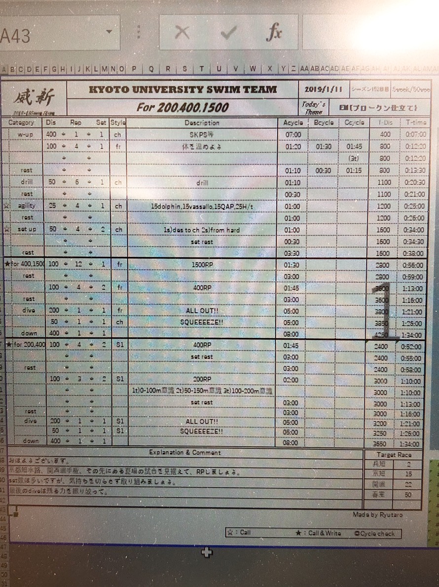 久々のUWが入ってたり、200のペース練があったりと少ししんどめだったかもしれません。その中でも自分の疲労度と相談して強度調整するなりして、しっかり疲労を抜ければよかったと思います。特に兵短出ない人は明日はレペなので、ストレッチするなり早く寝るなりして万全に近い状態で臨んで、ベスト狙っていきましょう!