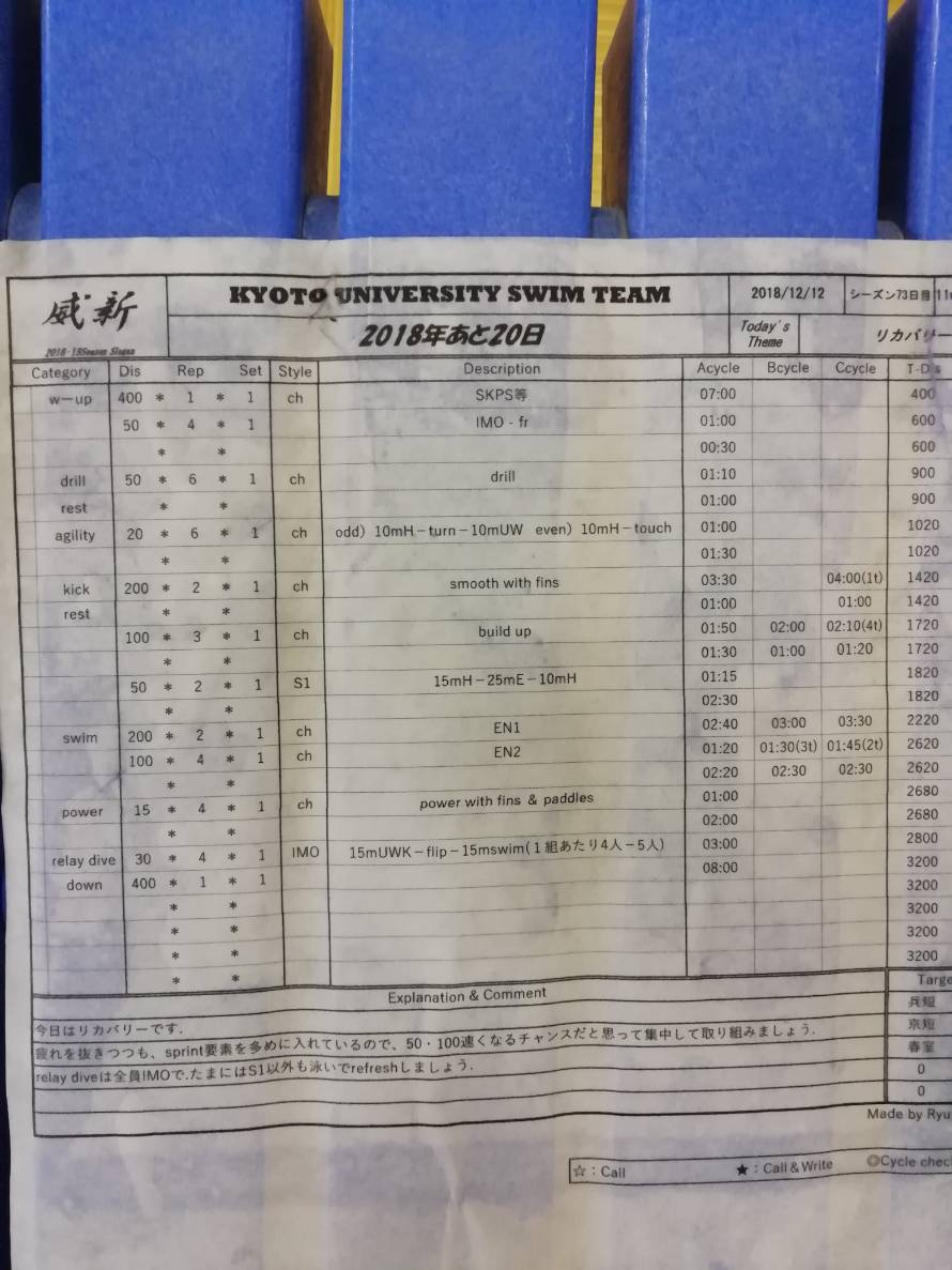 個人的には、最近お目にかかれないキックの練習があったので嬉しかったです。キックはホントに嫌いですが、その必要性はひしひしと感じています。キックはスイムよりも腹圧が入りやすいと感じていて、かつ体が水面に対して水平である状態を確認することが出来ます。とにかくキックは大切です。遅いですけど。