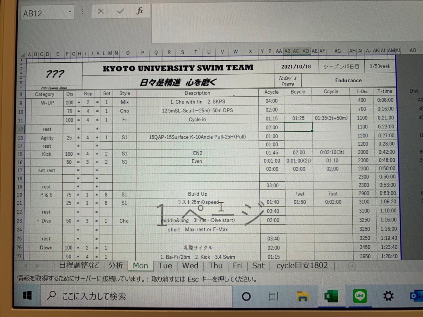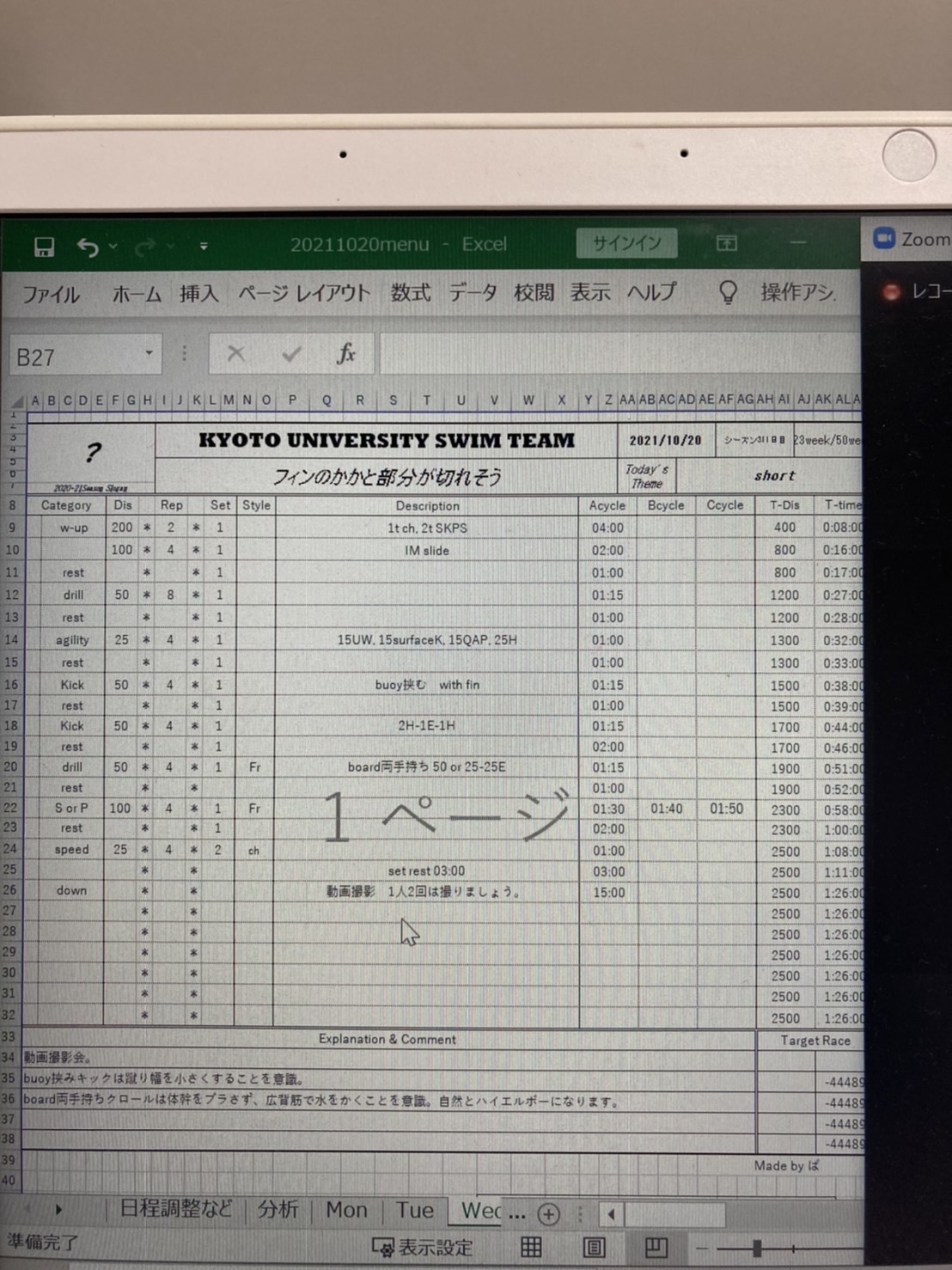 久しぶりにフリーで長距離泳ぎました。最初のキックのところで姿勢を意識したら、その後のスイムで水に乗る感覚が掴めました。でも、メインの後半は体力なくてバテバテでした。