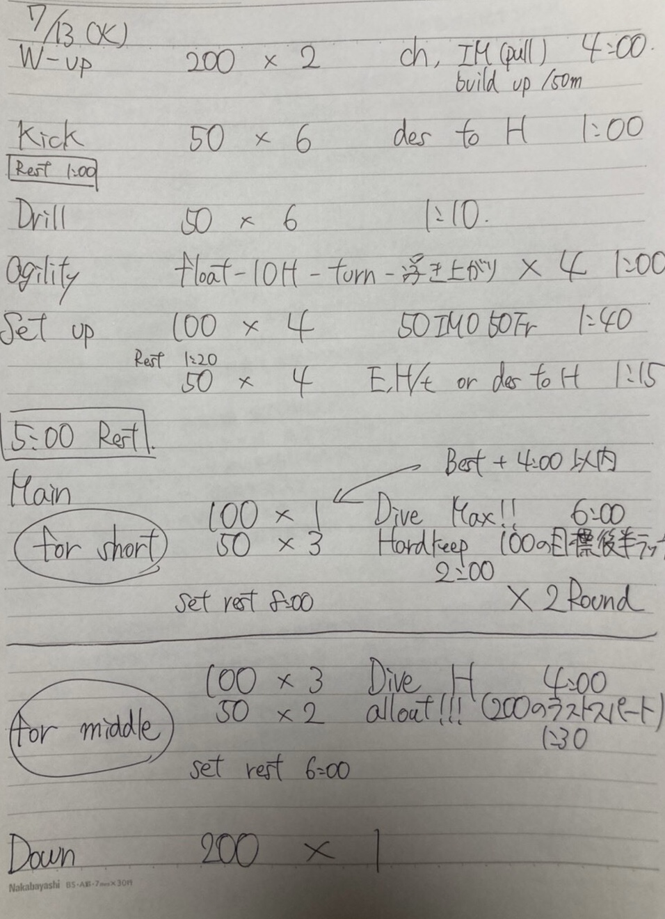 速い人もいるし競ってくれる人もいるし、過去最高に練習が楽しいです。(ターン前かきまくってるけど)KICK長水 1:45回れるようになってました。入部したときは2:00回ってなかったです。SWIM長水 1:20もHR160くらいで泳げますが、入部したときは1:30ギリだったです。回れてなかったかも。