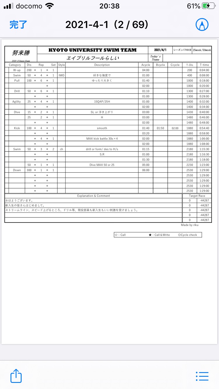 とりあえず、引退までには自粛前の1月の泳速には戻したいな、って思ってます。もう一回Aサイクル回れるようになりたいです笑