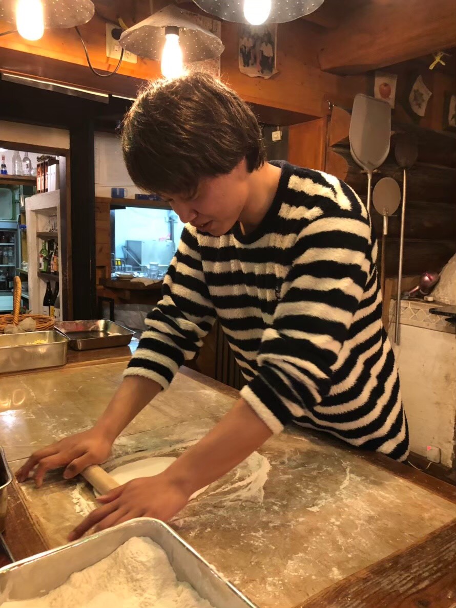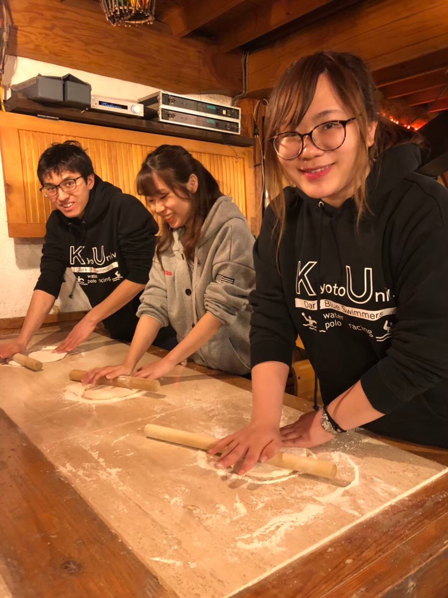 私は1歳からずっと水泳をしてきてたんですが、高3の引退試合終わってからは、もう水泳は満足したしもういいや、大学行ったら違う競技して才能開花することを狙うかーと思っていました。でもやっぱり水泳には興味があったんで水泳部のインスタの投稿とか見てたら、合宿でピザ作りしてたんです。私は水泳歴はばかみたいに長いのですが合宿という合宿にほとんど行ったことがなかったので、合宿に憧れていました。そんな合宿もできるし、ピザ作りとかしててめっちゃ楽しそうやし、なんかいいなーって思って、自分の「水泳はもうしない」という決心が揺らいでいました。そんなこんなで紅萠祭の時に水泳部のブースに行ってみると、先輩方の勧誘がものすごくて、なんかこんなに勧誘してくださるのなら、楽しく水泳できそうだし、入るかーってなりました。つまりは、私が水泳部に入ったきっかけはピザですね。豊田はピザでつられました。私がつられたピザ作りの写真。