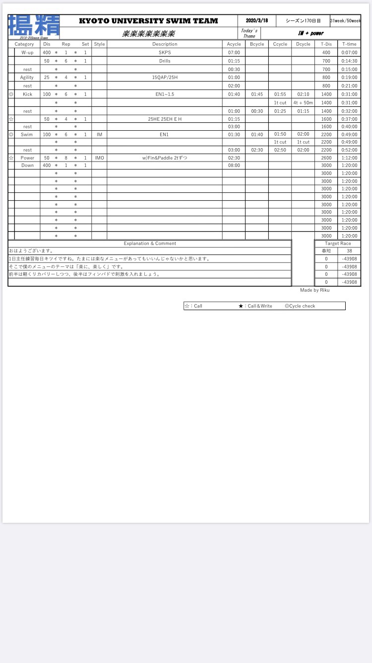 距離別main。私は②をやりました。200の第1、2・3、第4ラップ狙う感じで泳いだんですが、感覚とズレまくりました。